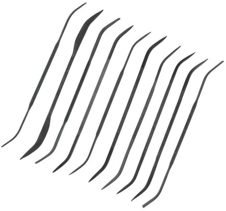 Double ended files ideal for getting into hard to reach areas Set includes 10 different profiles, half round, knife, round, flat, triangle, crossing, square, equalling and triangle with 2 smooth sides.