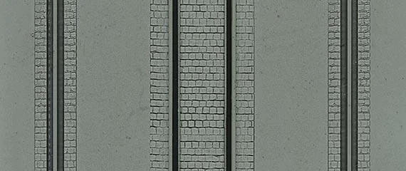 Sheet of plastic moulded and coloured to represent the real thing. Cards can be joined together to make larger area. You can also paint and weather the sheets for added realism. One wide pair of tracks for a harbour crane and central tracks 16mm wide suitable for OO or HO models.
