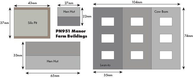 The large barn measures 69mm (length) by 74mm (width). The lean-to measures 74mm (length) by 35mm (width). The large hen hut measures 65mm (length) by 33mm (width). The small hen hut measures 27mm (length) by 22mm (width) and the silo pit measures 43mm (length) by 37mm (width).