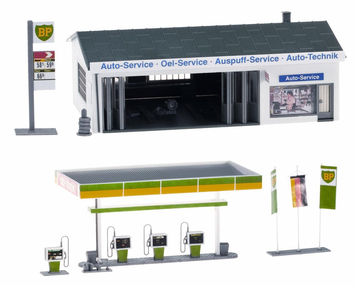 This is a pre-coloured 00 scale plastic kit of a petrol station, comprising the pump island and separate building which doubles up as a workshop and mini-mart. Appropriate decals and decoration items are included in this kit.