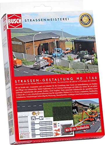 This kit contains an abundant amount of accessories to complement a road maintenance scene, i.e. 80 cm of self-adhesive, white-striped asphalt roadway (for straight roads, not flexible), mown grass strips (2 pieces each 400mm (length) by 110mm (width)), an un-mown grass strip (145mm (length) by 100mm (width)), guard railings, a sand pile, a wheelbarrow, traffic cones, a welding torch, tools, road signs, a trailer with a construction warning sign (without lights), etc.