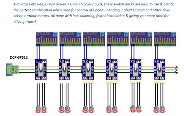 Available with Red, Green or Red+Green bicolour LEDs, these switch packs are easy to use and create the perfect combination when used for control of Cobalt iP Analog, Cobalt Omega Analog and other slow-action turnout motors. All done with less soldering, faster installation and giving you more time for driving trains!