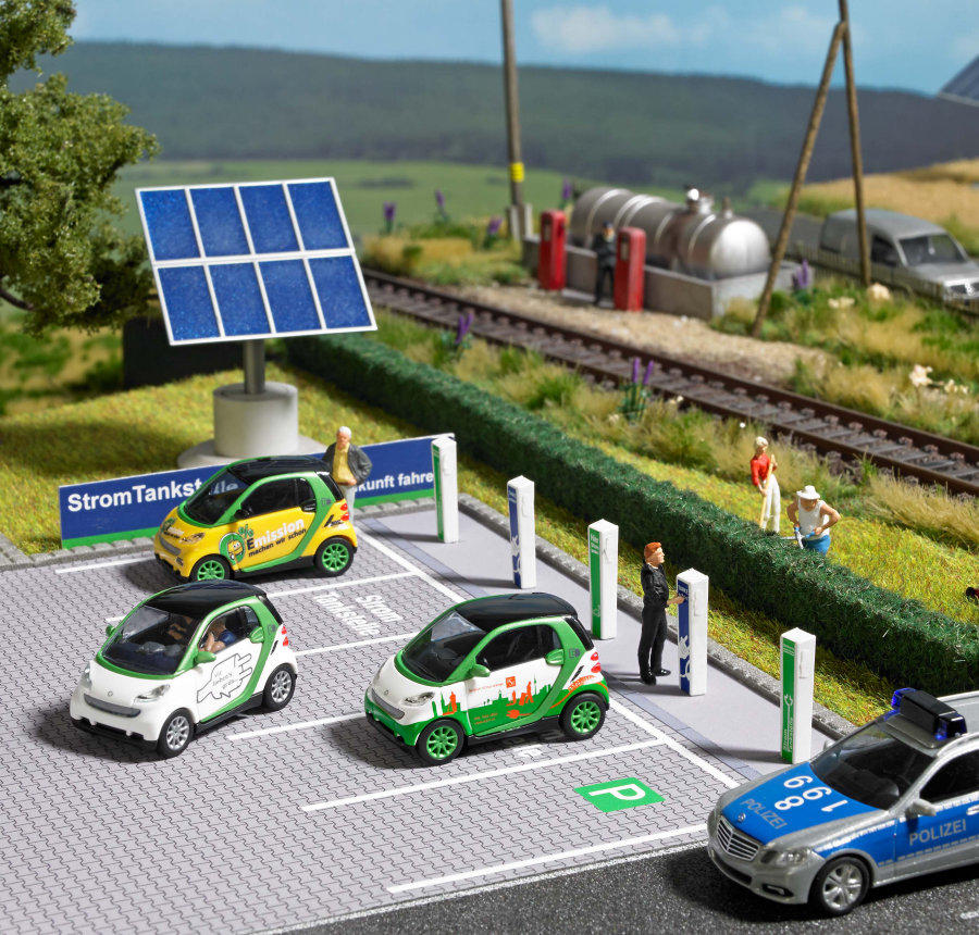 This is a charging station with 6 finished bays for recharging electric vehicles. Included are printed parking bays (148mm (length) by 105mm (width)) with parking spaces for vehicles to be refuelled, a solar collector for electricity and cut-out sheet with billboards and signs.