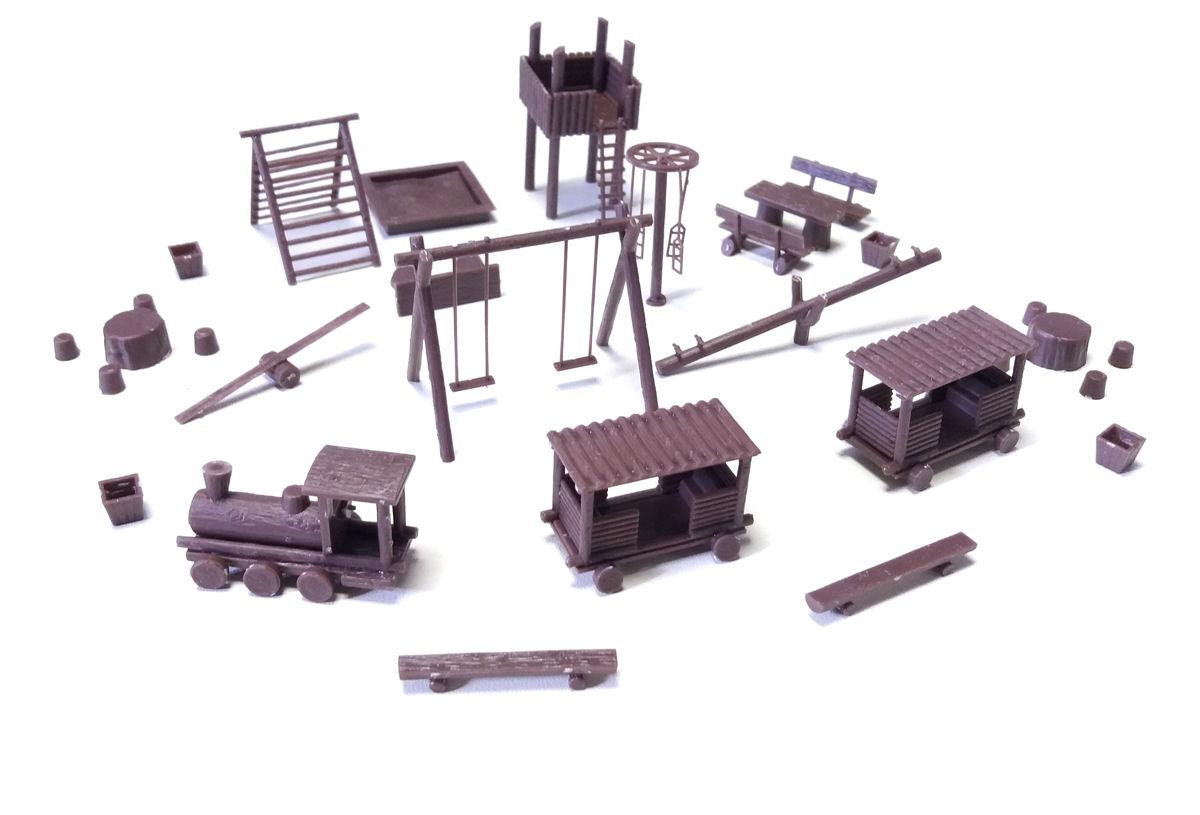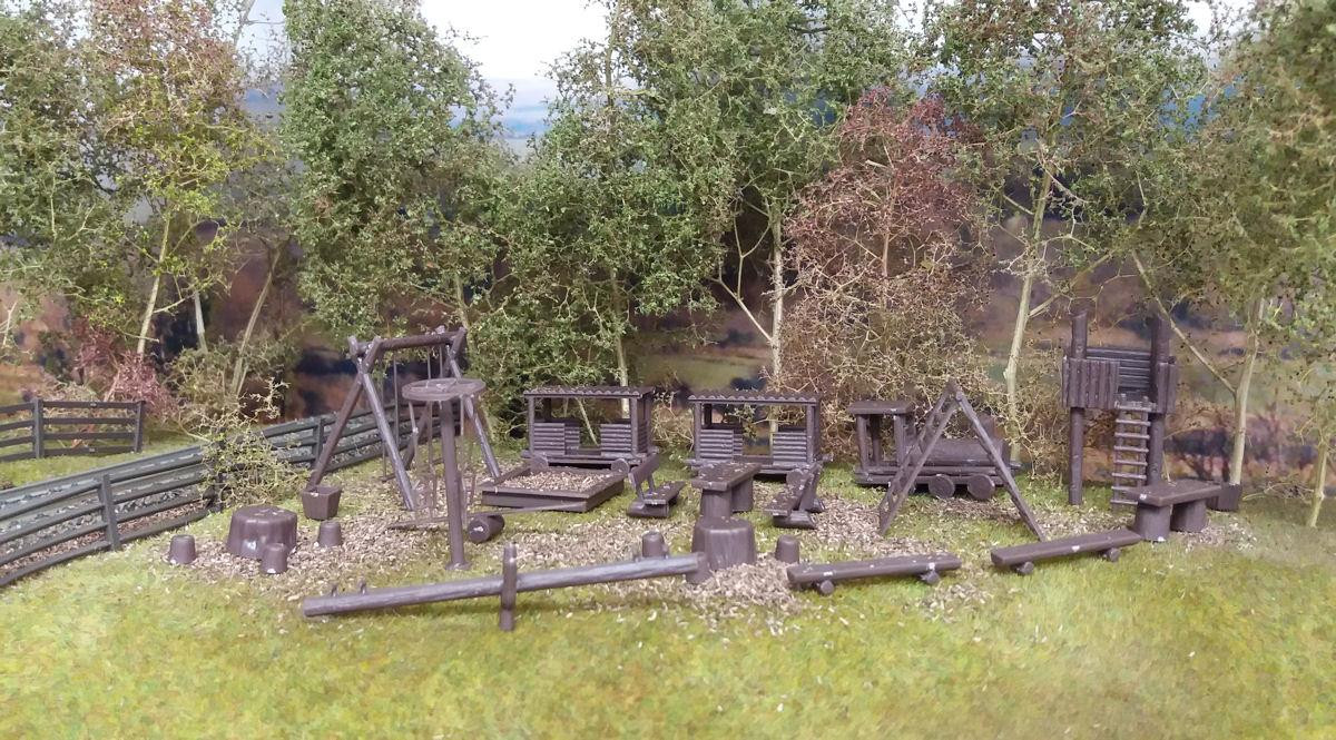 This is a pre-coloured plastic kit of a typical childrens wooden play park. This kit contains climbing frames, swings, hideouts, towers and benches which can be arranged as you wish. Additional painting will really bring this kit to life.