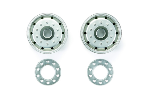 Actual tractor trucks are often seen with plain natural-metal wheels made of steel or aluminum. To depict this type of wheel, these matte finish metal-plated wheels for 1/14 scale R/C tractor trucks and semi-trailers are available as an option accessory. By simply replacing with kit-standard gloss finish metal-plated wheels, you can give your truck or trailer a different appearance.